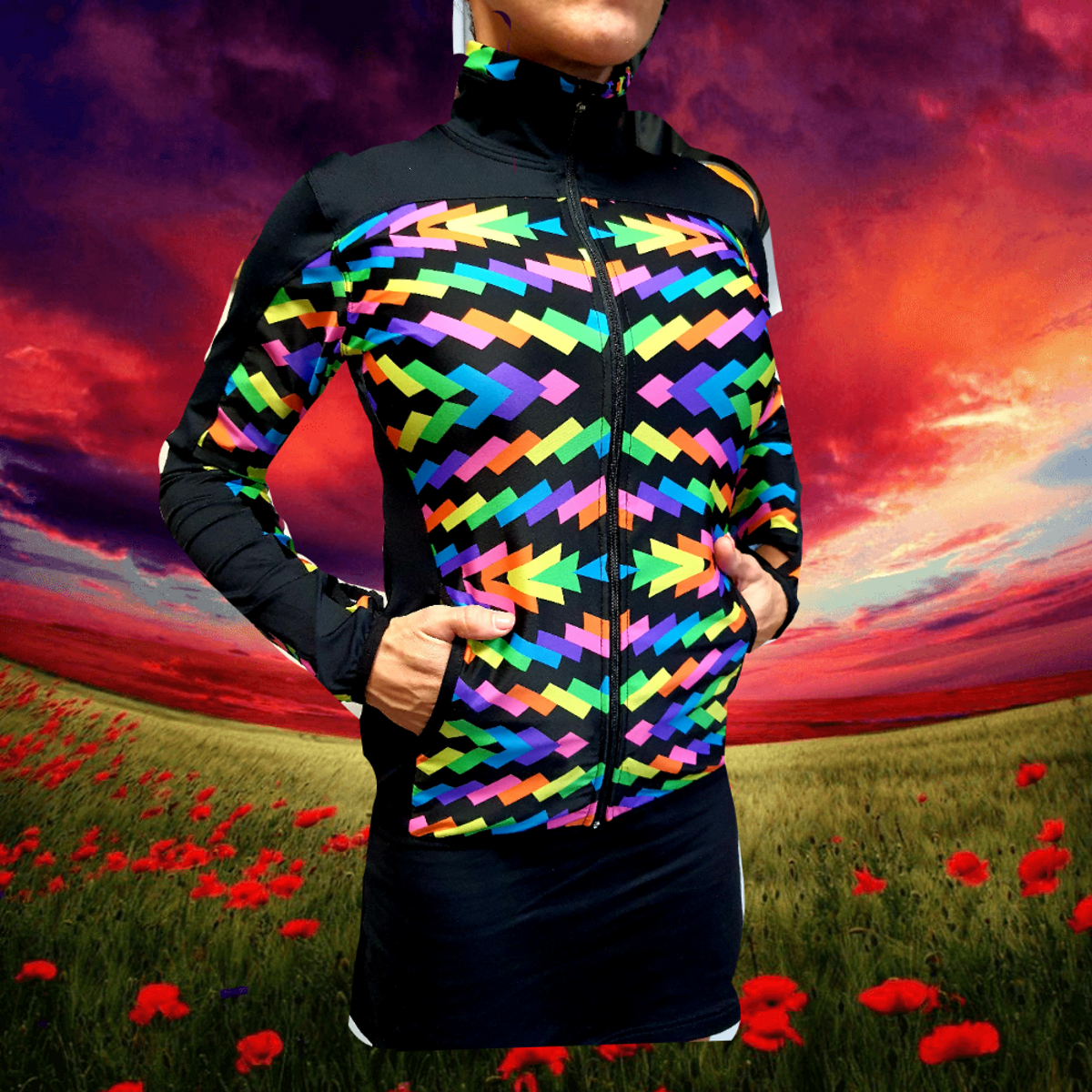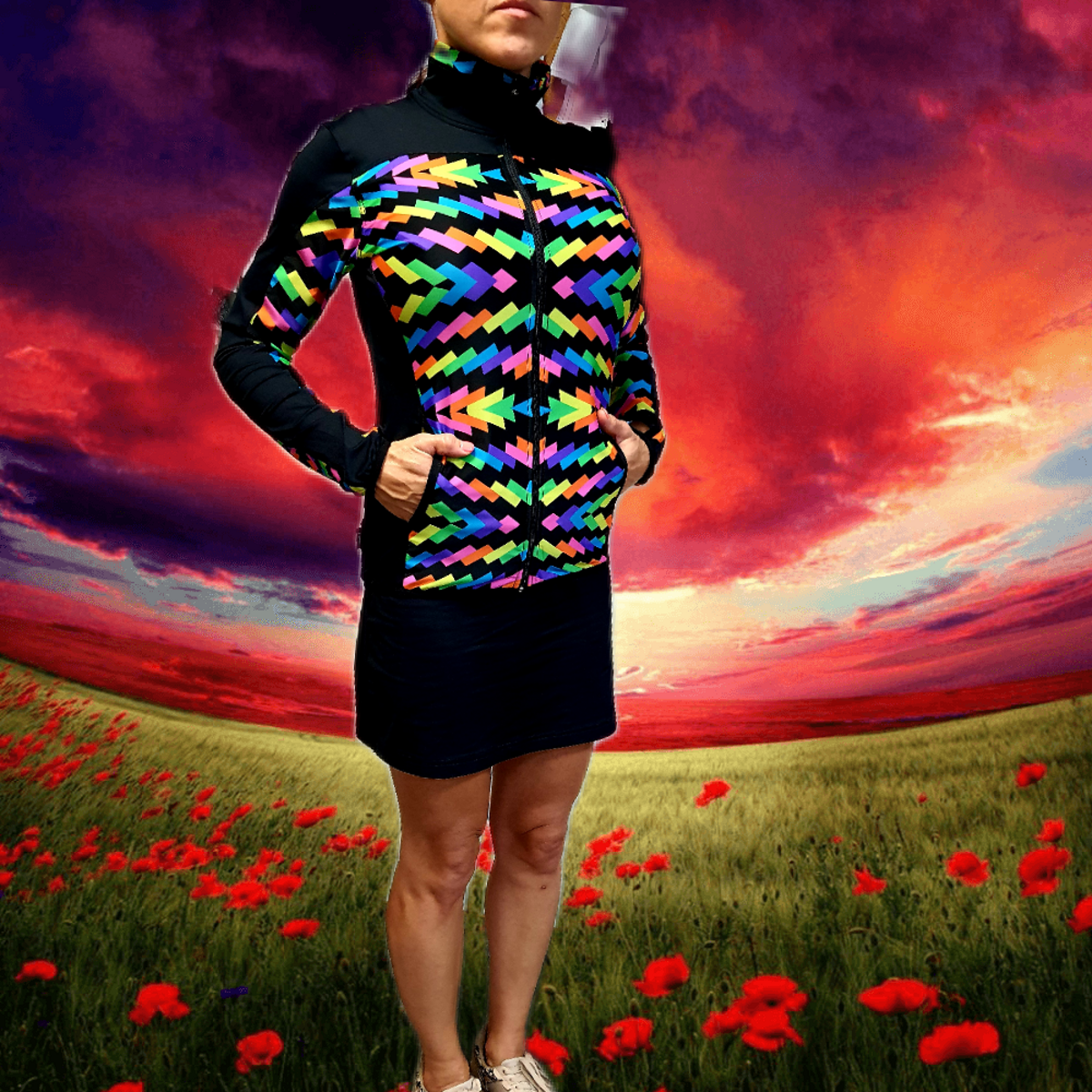 - Dámská sportovní celopropínací bunda se stojacím límcem a kapsami v bočních švech.