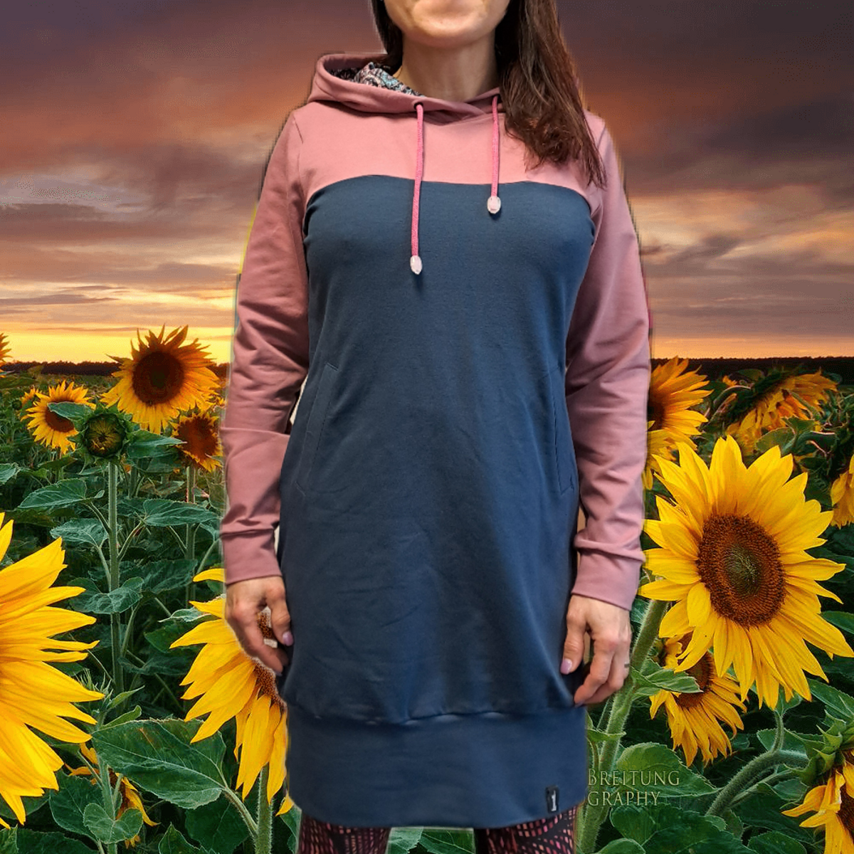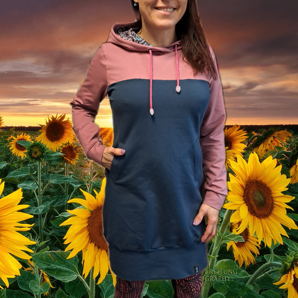 mikinové dvoubarevné šaty s kapucí a dvěmi kapsami
