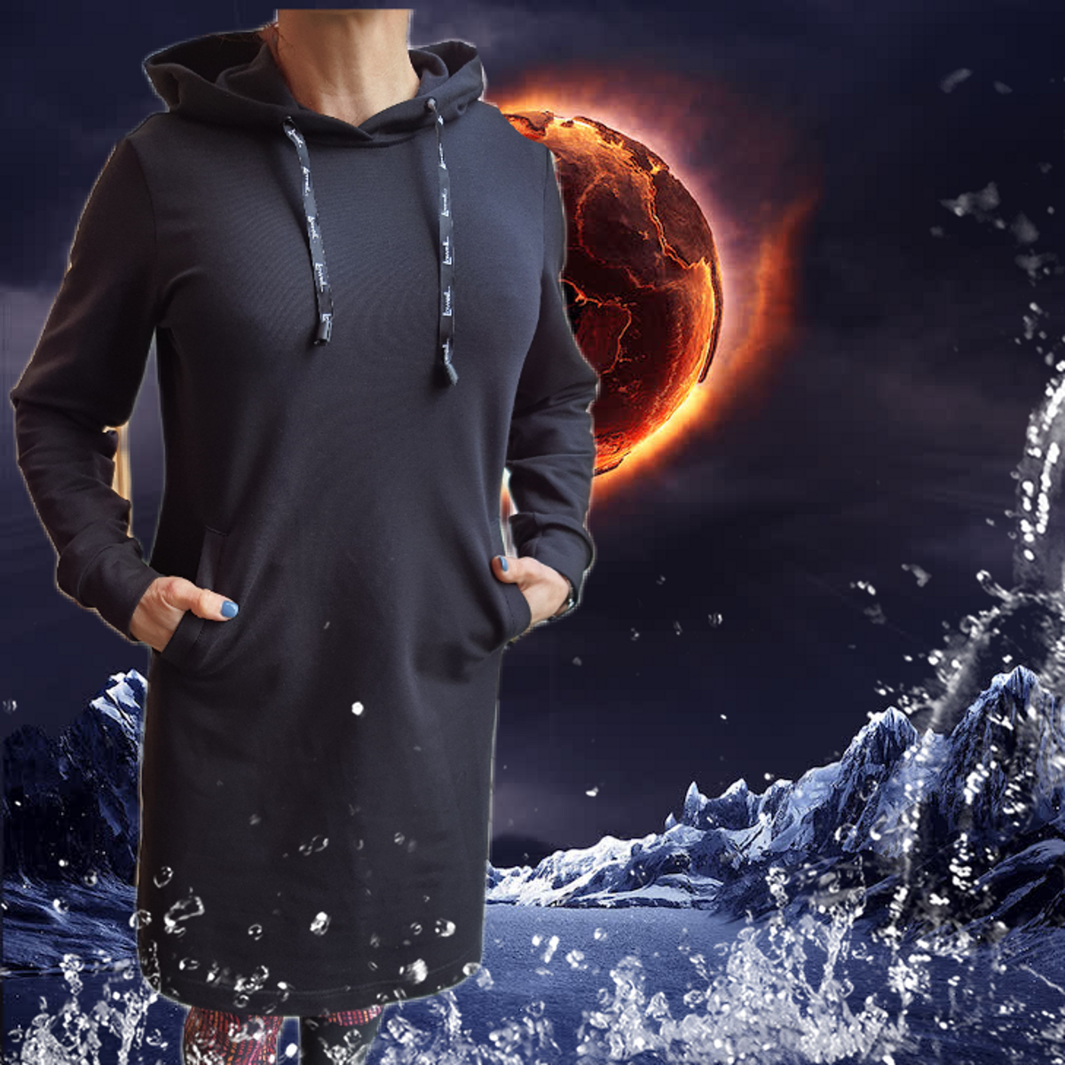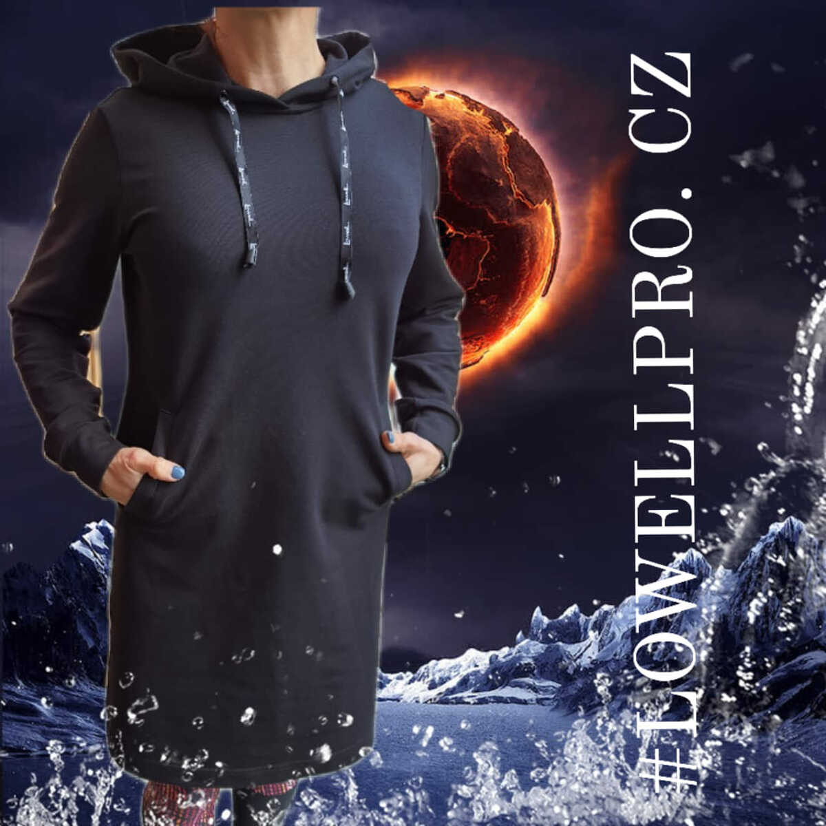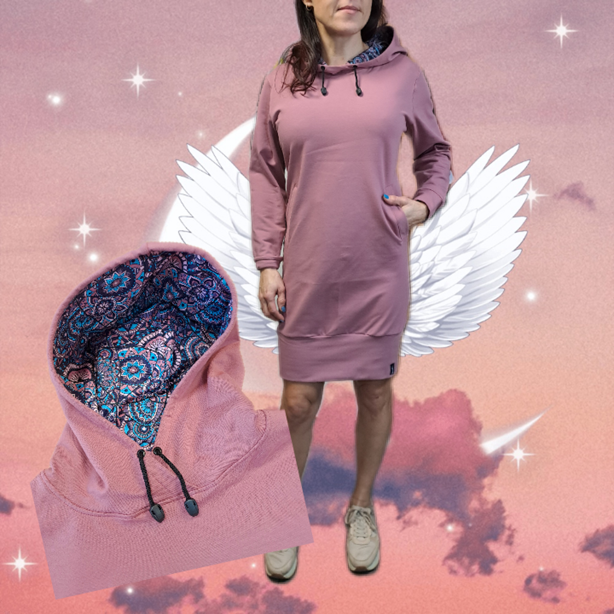 mikinové šaty s kapucí a dvěmi kapsami